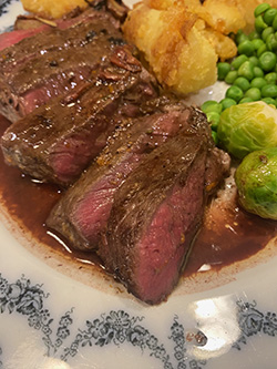 This is haunch steak, cut from the haunch joint. Marinated for 4 hours in smashed garlic, 🧄 pinch of dry chilli 🌶️ rosemary sprigs 🌿 orange zest 🍊salt and pepper, mixed with a little olive oil. Rubb onto the steaks, seal in plastic bag and refrigerate. Flash fry in hot pan to brown then place in the oven at 180 degrees to cook to your liking, this is medium rare (6 mins). Serve with green veg and roasted celeriac, parsnips and potatoes (par-boiled, tossed in semolina then roasted in beef dripping). All ingredients can be found in our shop.